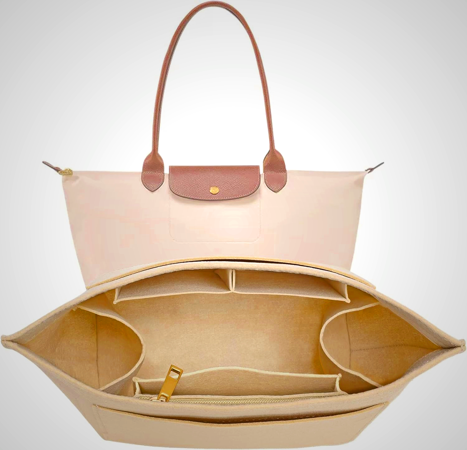 Keep your Longchamp Le Pliage M tote bag tidy and functional with this felt purse organizer insert. It features a built-in cup holder and multiple compartments to securely store essentials. Available in sizes Small, Medium, Large and colors including Beige, Black, Dark Blue, Earth Color, Green, Light Grey, Vine Red, and Cabas. This durable insert helps protect your bag’s interior and makes finding items quick and easy.